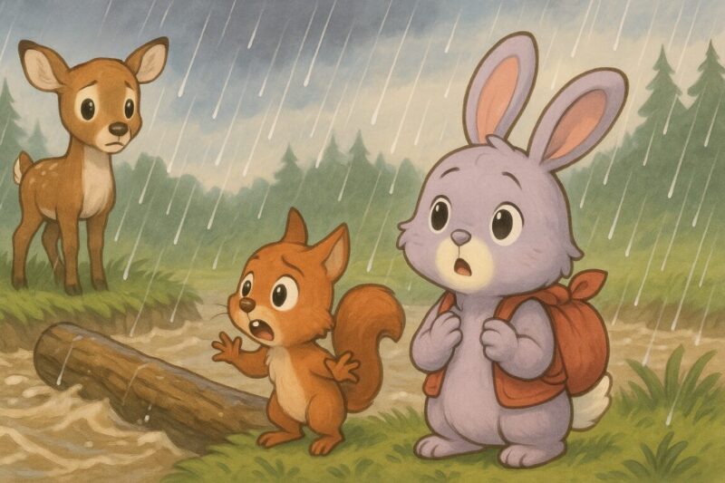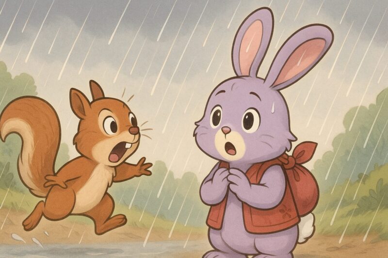 ある日、森に雲がかかり大粒の雨が降り出してきました。