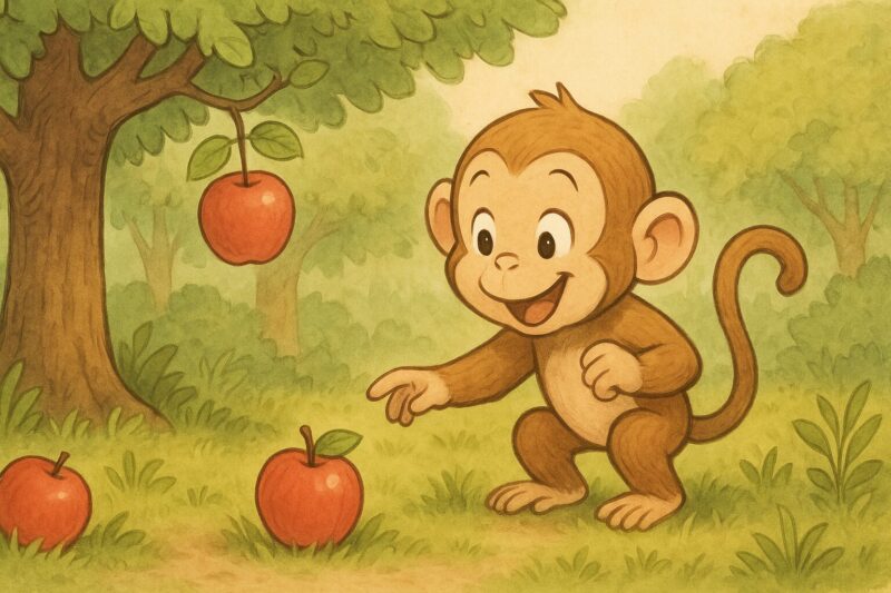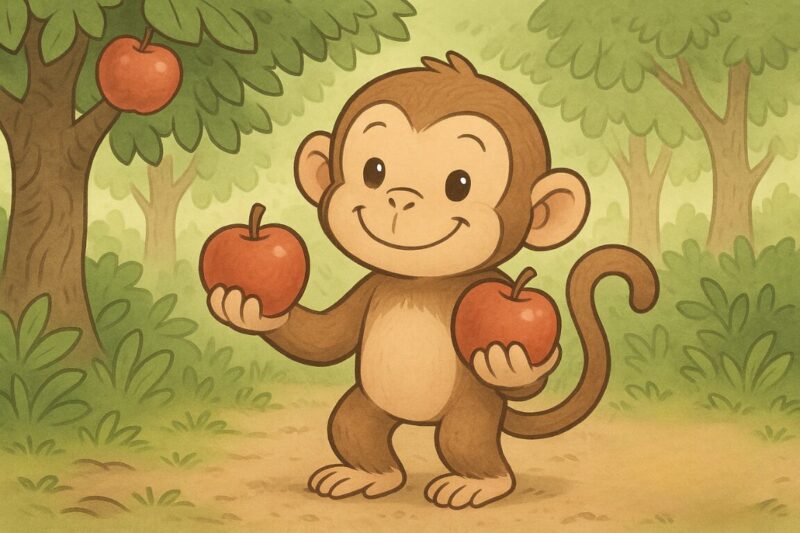 サルは、リンゴをぎゅっと握りしめ、ニヤリと笑いました。