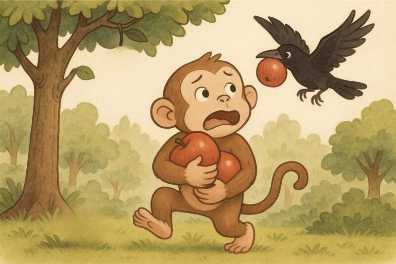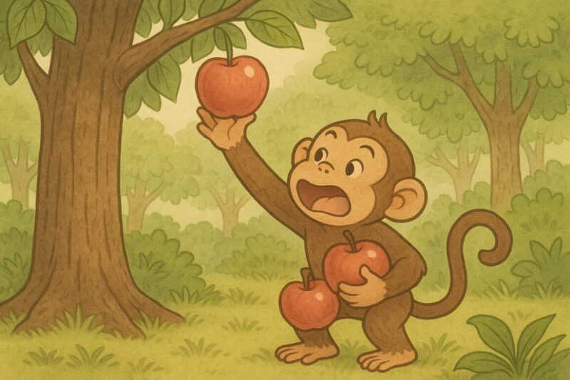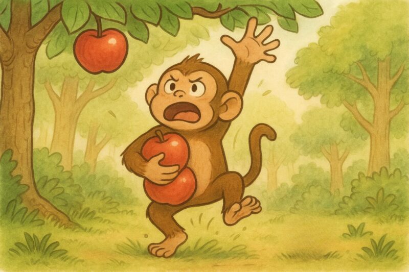 サルは、あわててリンゴを抱え込むのですが、そうなると木になっているリンゴを取ることができません。