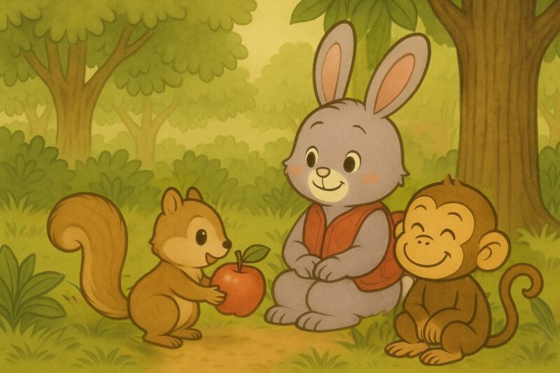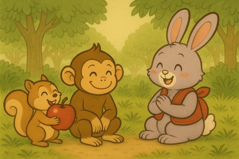 その時、草むらの向こうから、リスが落ちていたリンゴを持って、サルとモフ子のところにやって来ます。