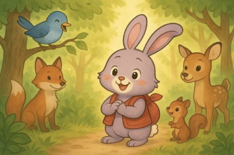 ChatGPTに、主人公のモフ子が森の動物たちと笑顔で挨拶をしている画像を作って欲しいと指示を出すと出来上がったのが次の画像です。