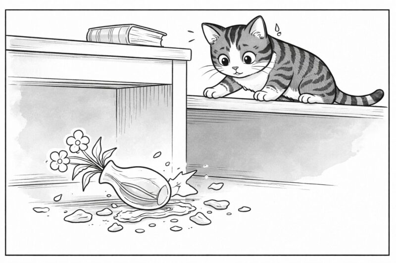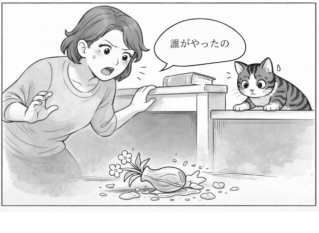 今回の物語は、主人公の猫が机の上に置いてある花瓶を倒して割ってしまうという話から始まります。