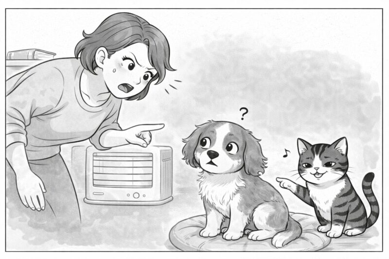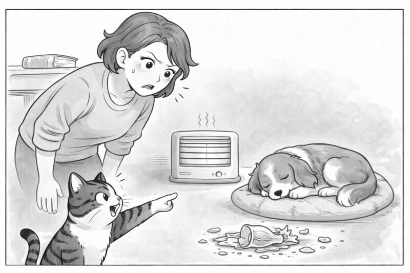 それを見ていた猫は、自分がやったのにもかかわらず、ストーブのところで寝ている、おっとりしている犬を指差します。