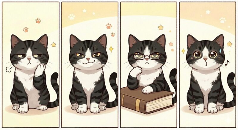 このような性格を考えて、画像生成AIに指示したところ、次のような猫のイラストが出来上がってきました。
