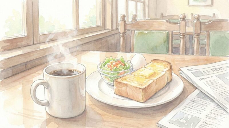 朝の散歩の途中に入った喫茶店のモーニングを水彩画風で描いてください。