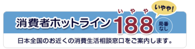 - 消費者ホットライン(局番なし「188」): 独立行政法人の国民生活センターに繋がります。
